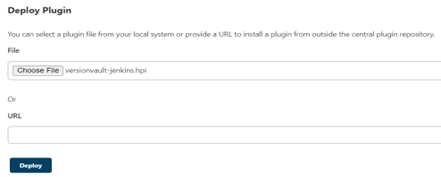 (d) Scroll down and go to option "Deploy Plugin". Then select “Choose File” option to select two plugin files i.e., HCLDevOpsCodeClearCase-jenkins.hpi and cmapi-jenkins.hpi then click on “Deploy”.