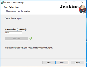 - On the Port Selection dialog box, enter the port number you want Jenkins to run on and click Test Port to check if the selected port is available.