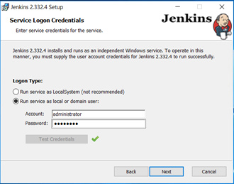 - On the Service Logon Credentials dialog box, for the Run service as a local or domain user option, enter the domain username and password for the user account that you want to run Jenkins with. Click Test Credentials to verify the credentials data. (The Run service as Local System option is a less secure and therefore not recommended.)