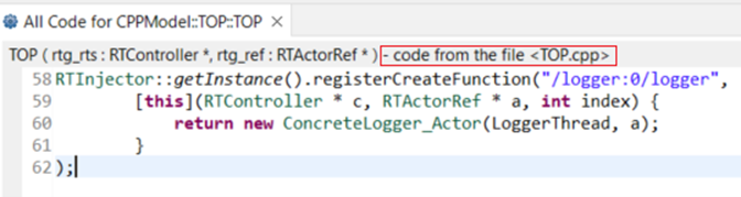 Each code snippet now shows extra text after the code snippet name that tells where the code snippet comes from (either from a generated C++ file, or from the model). In the former case you can navigate to the code snippet in the generated file by means of a context menu Show in Generated Code. If the code snippet is empty, no extra text appears after the code snippet name. This makes it easy to quickly see which snippets contain any code when all code snippets are collapsed in the Code Editor.