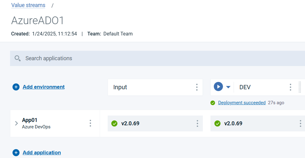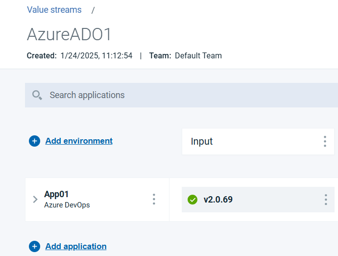 The Azure DevOps plug-in syncs the repositories, builds, pipelines, releases definitions, environments, pipeline runs, and release executions for every five minutes with to HCL DevOps Velocity. An application is created in HCL DevOps Velocity pipeline. A pipeline application is created in HCL DevOps Velocity and map the application in HCL DevOps Velocity. The build that is created after mapping the application appears as version in the Input column of the HCL DevOps Velocity pipeline.