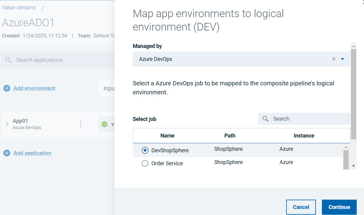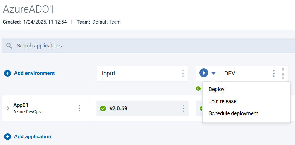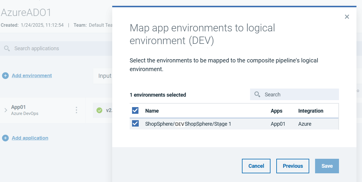 The application environment can be added in the HCL DevOps Velocity pipeline. For example, DevShopSphere is the application environment added to DEV environment for the release as shown in the following graphic.