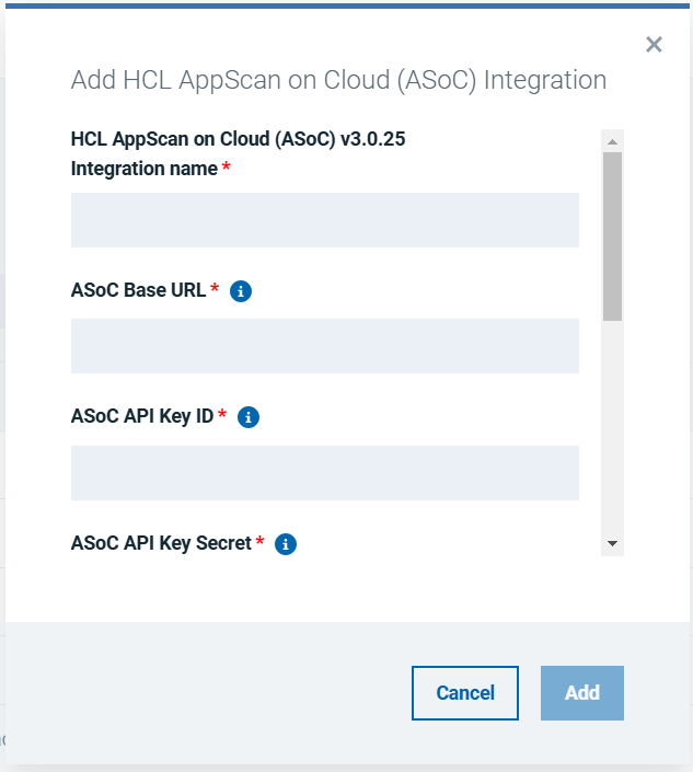 To use the HCL AppScan on Cloud plug-in (ASoC), the plug-in must be loaded, and an instance is created before you can configure the plug-in integration. You can define configuration properties either in the user interface or in a JSON file of a value stream.