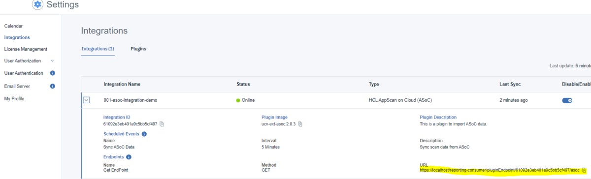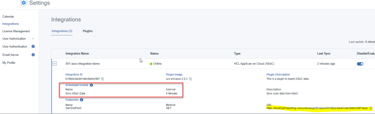 You can use the ASoC plug-in’s endpoint integration to sync or import the scan data into HCL DevOps Velocity’s application vulnerabilities metrics by triggering the API endpoint with GET or POST request.