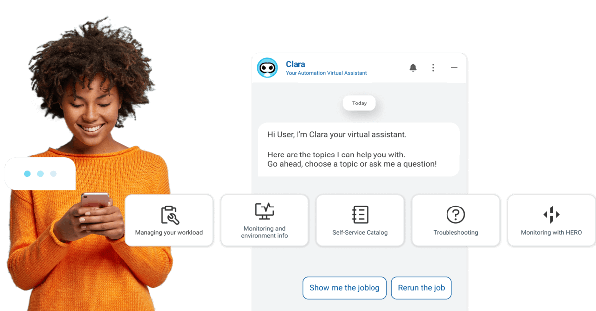 I’m here to introduce you to HCL Clara, an Intelligent Virtual Assistant, who can enhance Workload Automation customer experience with natural language processing (NLP) interactions.