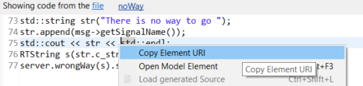 The Copy Element URI command is also available in the context menu of the Code View and Code Editor. It places a URI on the clipboard which the Navigate by URI command can use for navigating to a particular line of a code snippet of a model element. This feature can for example be useful when you want a colleague to look at a specific line of code in a model you are collaboratively developing.
