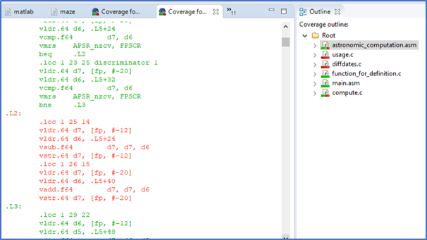 - When C and ASM compilation units are mixed in a single project, run code coverage on all units using the right tool for C or assembler and generate a single report (see the image below for an example)