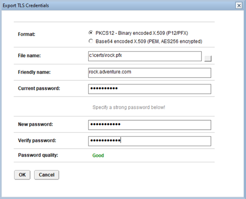 2. After the credential request has been processed and has a valid certificate, use the TLS Credential document’s [Export TLS Credentials] action button to export the certificate. For the purposes of this example, PKCS12 format is selected, and file is exported as type PFX.
