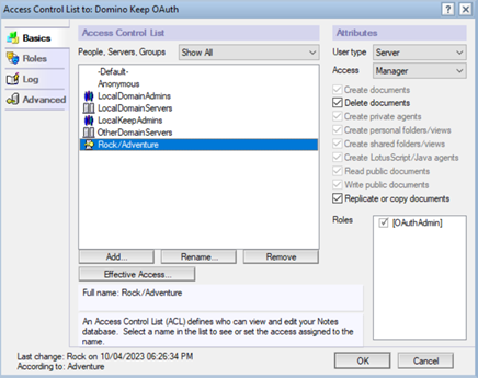 The Domino Keep OAuth, oauth.nsf, database requires Default access to be Author without the Delete flag. This allows users to revoke their consents using the Admin UI.