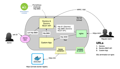 | Healthcheck Port | 8886 | Used to verify whether Domino REST API is up using the /health endpoint. It has its own functional account that does not provide access to other ports. |