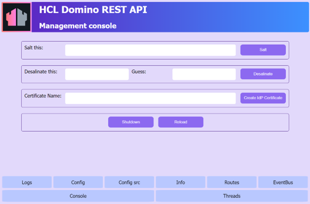 You will use this example to create your configuration file, specify a different user name if you wish. After issuing a ‘tell restapi reload’ at the Domino console, access the Management console using https://localhost:8889. Note: to login enter the user name listed in the configuration file (it is case sensitive) and the password is password.