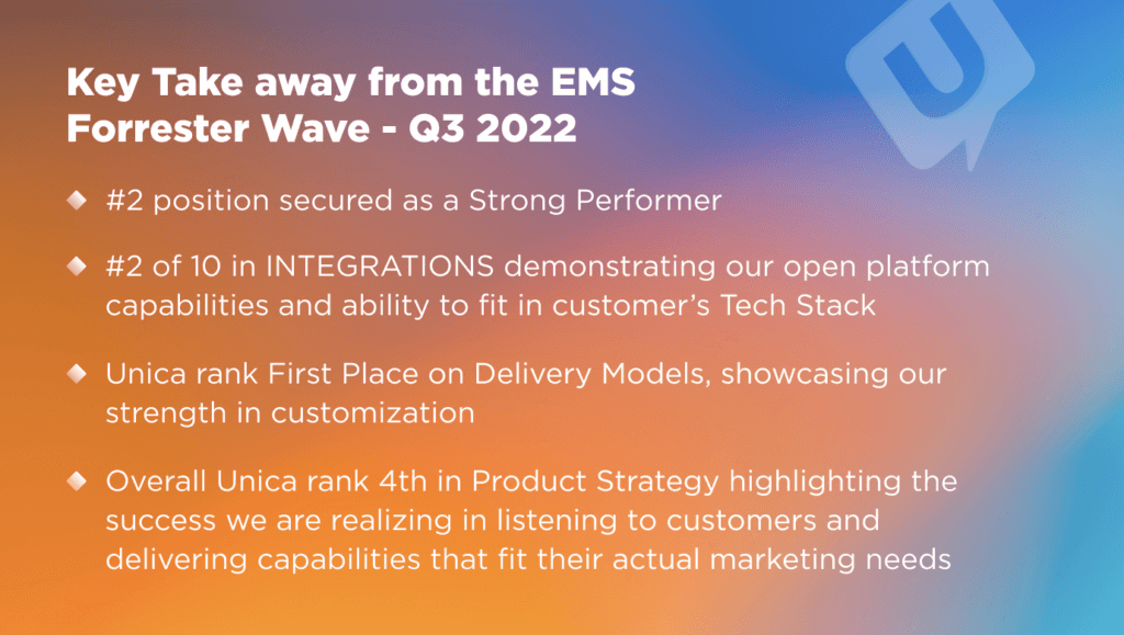 You can download your complimentary copy of the full report: The Forrester Wave™: Enterprise Marketing Suites, Q3 2022. to read more about what got Unica as the strong performer.