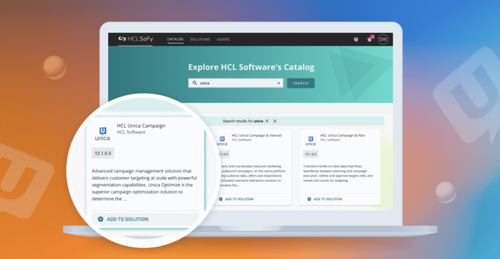 HCL SoFy is the foundational Cloud Native experience platform that allows clients to deploy HCL Unica on their cloud of choice without vendor lock-in and scale to enterprise needs. Customers can experience Unica (and other products from HCLSoftware) by browsing through the catalog of products, and demo packs, and accelerators, deploying them in a matter of minutes on the SoFy sandbox or on a local environment.