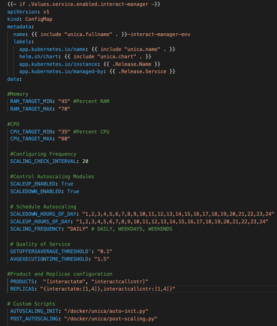 Unica Interact Helm chart configurations enable fine control over the autoscaling process to meet specific needs. It is possible to define scaling thresholds directly in the helm charts. Additionally, this solution offers granular control, enabling us to disable individual Unica autoscaler modules (scheduling, QoS, etc.).