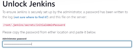 - On the Unlock Jenkins dialog box, in the Administrator password field, enter the password that you got from Step 3 of Jenkins Installation section, or you can get the password from initialAdminPassword file and then click Continue.