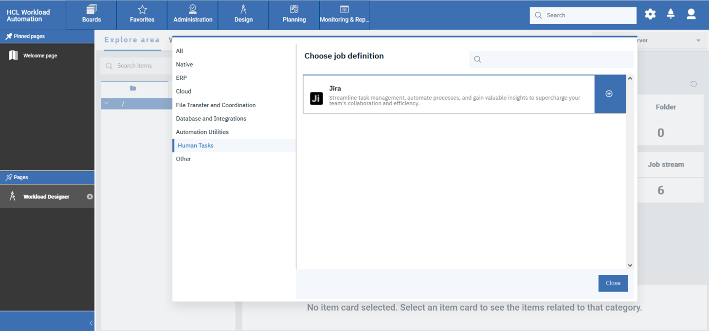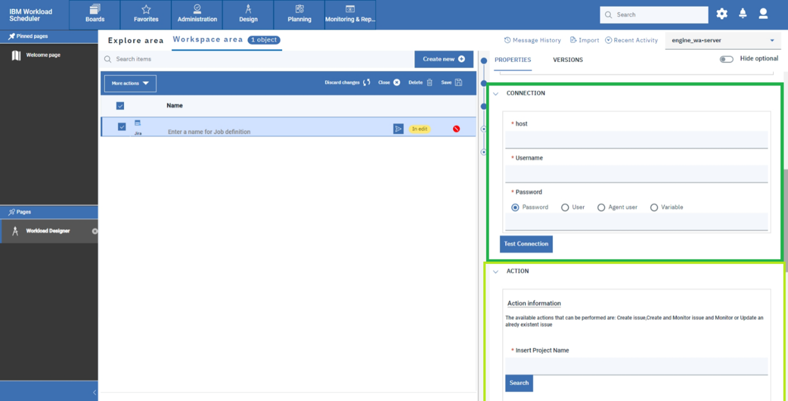 In Jira plugin properties there are two panels: CONNECTION and ACTION