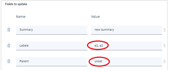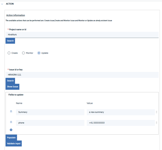 In the ACTION panel, if you choose Update operation, you can perform a Transition for the specified issue and update all editable fields of the issue inserted.