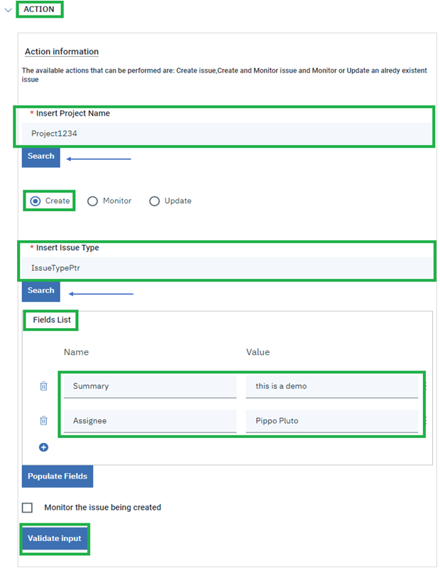 You can enter the fields manually using the “+” button, placed below the list. In alternative use, the button Populate Fields to generate all fillable fields.Populate the issue type into the Fields List.