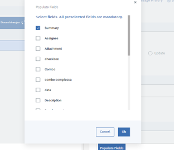 - The fields mandatory: All mandatory fields are listed and already selected in the list that opens when click on the button Populate Fields (“Summary” field is always mandatory).