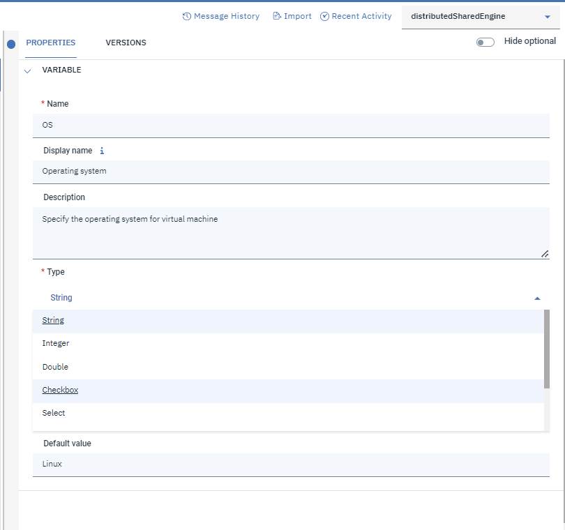 - For the virtual machine creation, Philip creates a string variable for the operating system configuring the following parameters: