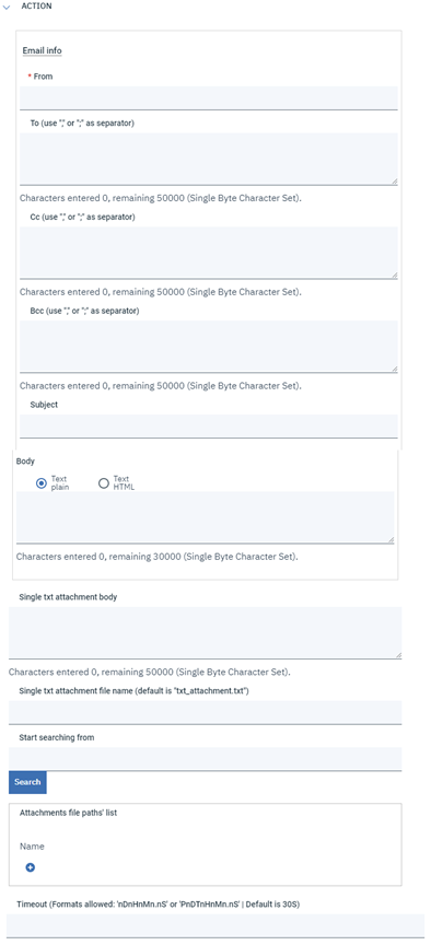 - Timeout: here you can specify the amount of time after which the job should end in ABEND status in case the email has not yet been delivered. If not specified, by default a timeout of 30 seconds will be set. If the email is delivered within the specific timeout, then the job will end in SUCCESSFUL status. Several formats are available, they are listed in the field's label.
