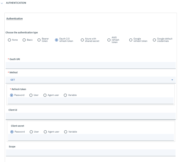 3. O-auth authentication: You can choose the options if one or both REST calls need it by manually providing the URL, the method, the refresh token if required, a client id, a client secret, and a scope.