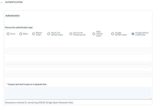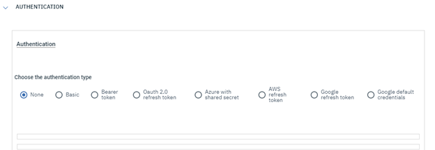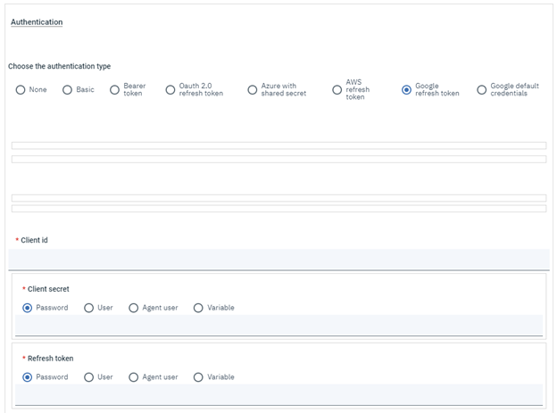 6. Google authentication with refresh token: You can choose this option if one or both REST calls need it by manually providing the client id, the client secret, and the refresh token.