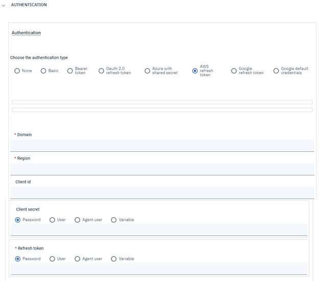 5. AWS authentication: You can choose this option if one or both REST calls need it by manually providing the domain, the region, the refresh token, and if required, a client id and a client secret.