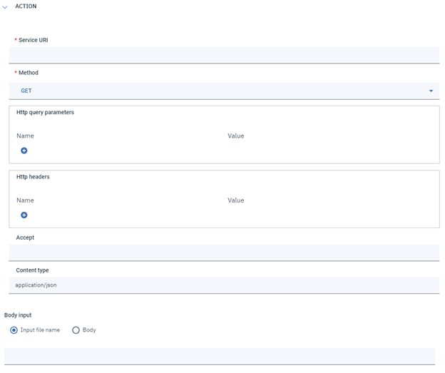 You can go to the Action tab and specify the URI associated with the service you want to call along with the method by selecting from GET, POST, PUT, DELETE, HEAD, or PATCH after providing the fields for the appropriate authentication, if necessary. Additional optional settings include: