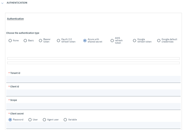 4. Azure authentication: You can choose this option if one or both REST calls need it. You can manually provide the tenant ID, client ID, scope, and client secret.