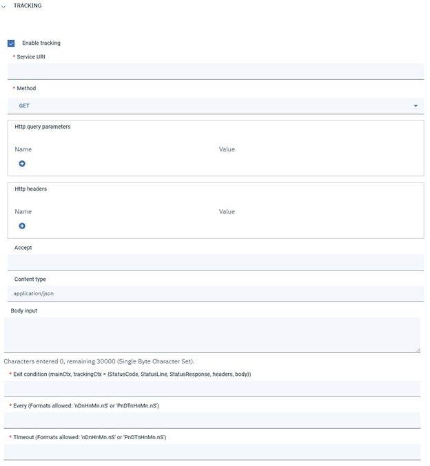 - Exit condition: A boolean JSONata query representing the condition that you want to verify each time the tracking request is executed during the polling. If verified, the polling will end. This boolean query should be written with respect to a JSON context, which contains both the context of the first request (we will call it MainContext) and the context of the tracking request (we will call it TrackingRequest). Both contexts are JSON objects with the following attributes: