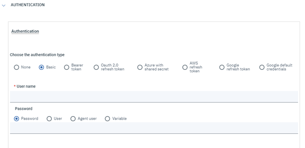 1. Basic authentication: You can choose this option if one or both REST calls need it, by manually providing the username and password.