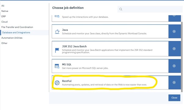 After downloading it, log in to the Dynamic Workload Console and go to Workload Designer. Create a new job and select “RESTful” in the database and Integrations section.