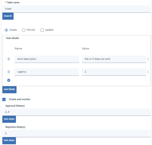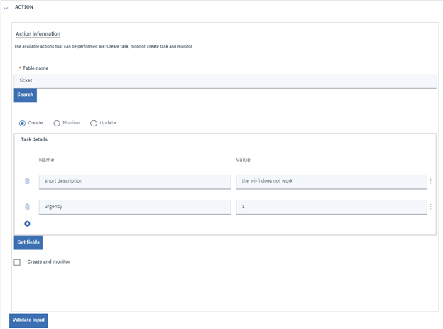 Furthermore, if you want to keep an eye on the ticket you have to create, you perform the creation and monitoring of a task, for which you have to select the “Create and Monitor” checkbox that is under the “Create” action. Creation can then proceed as described in the Create paragraph; monitoring works as described in the Monitor paragraph.