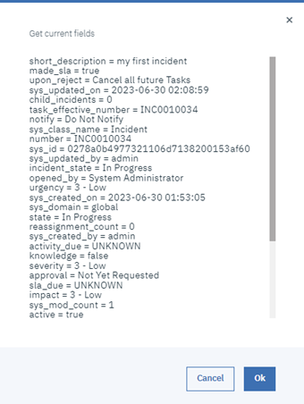 Note also that the user can click on the “Get Current Fields” button to see a list of all the fields (and their values) corresponding to that task. An example is shown below.