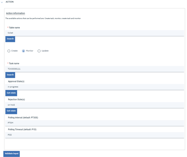 To perform the monitoring of a task, the “Monitor” radio button must be selected. After that, the id (or the name) of the task to monitor must be specified along with the state to monitor, which can be an approval and/or rejection state. In fact, the user may insert the approval state and/or the rejection state that the previously specified task must reach for the monitor to finish. If both are inserted, the monitoring will end as soon as either one is reached. Neither of the two states is required but at least one must be filled. In case the user is unsure of the correct values for states, the “Get State” button will provide a list of available states.
