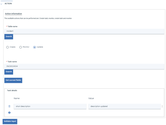 If the desired action is “Create,” it is mandatory to insert the table name (for example, the type of record to be created). Since the tasks you can create depend on how your instance is configured, the “Search” button will help by giving a list of the available tables.