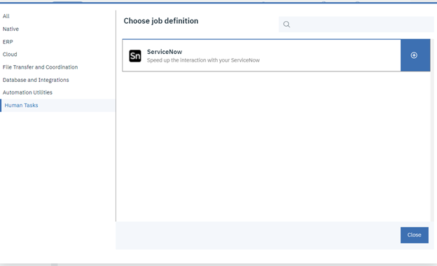 To enhance your digital workflow, download the ServiceNow plugin Automation Hub. You can then start to define a job and will find ServiceNow under the category “Human Tasks.”