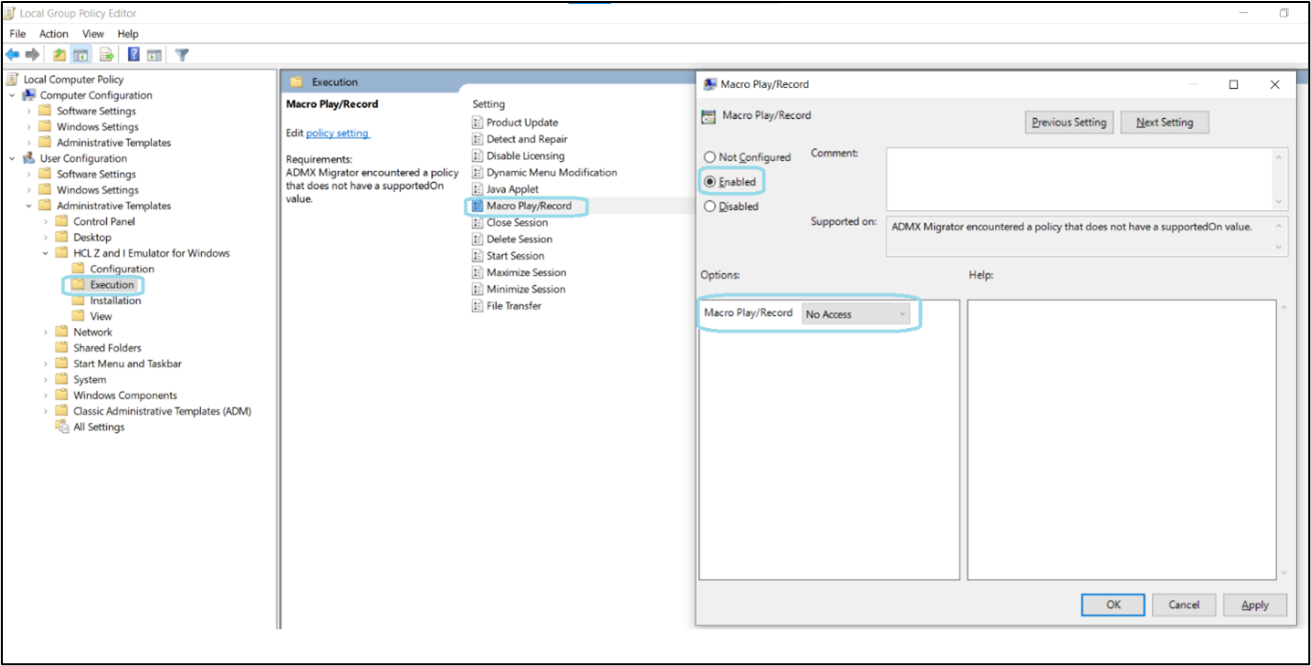 - Select Enable radio button and in Options Section-> Macro Play/Record select No access.