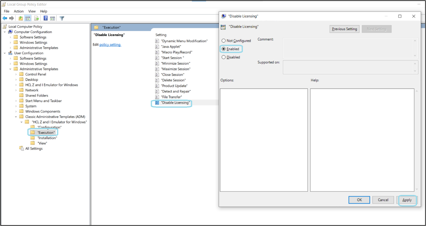 - Navigate to HCL Z and I Emulator for Windows ->Execution->Disable Licensing.